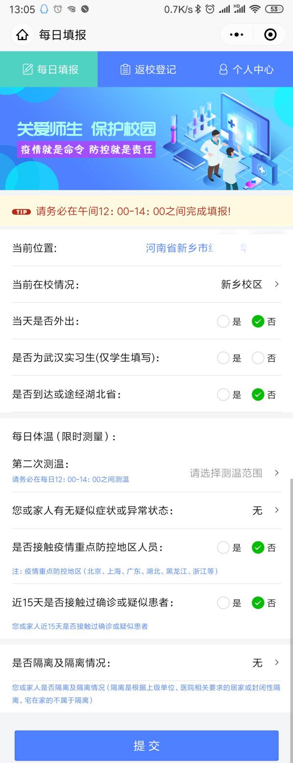 为了解决在此过程中存在填写不规范、统计不及时、工作效率较低等情况,校园网络管理中心联合寻道科技有限公司开发了疫情上报小程序,用于上报和监测教职工和学生身体状况以及返校登记交通情况。师生每日填报2次体温,同时系统通过手机定位自动记录打卡的人所处的地理位置。该小程序5月15日起正式部署上线,及时、准确、高效的收集人员信息,运行良好,使得疫情防控工作开展更加顺利。