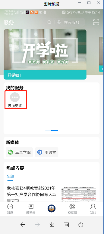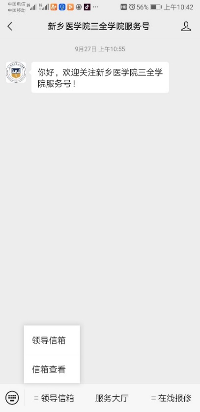 新乡医学院三全学院服务号二维码 点击“领导信箱”,使用统一身份认证账户密码登录即可留言办理。
