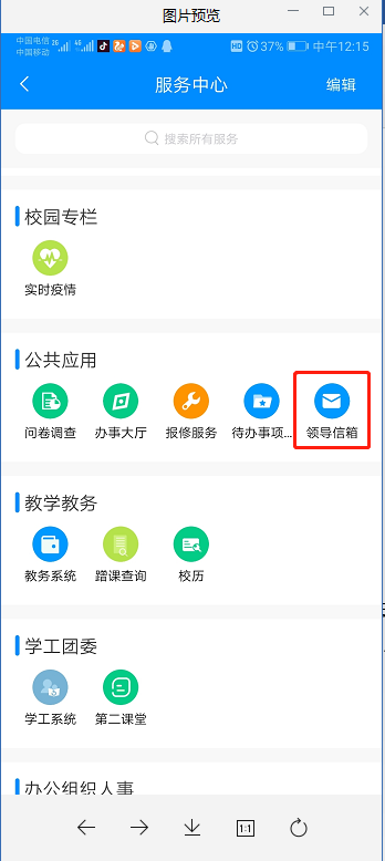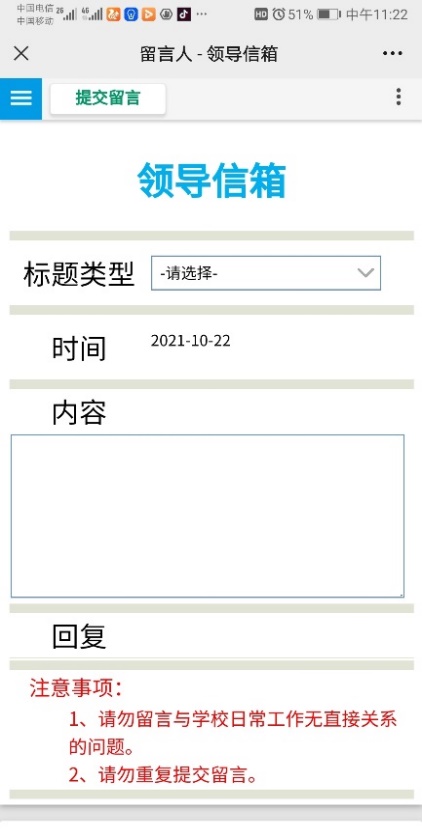 全体师生员工: 为进一步畅通沟通渠道,健全双向沟通机制,及时了解和解决师生员工在工作、学习、生活中存在的问题和困难,听取和收集师生员工对学校改革、发展、建设的意见建议,经研究,学校决定即日起启用“领导信箱”微服务。 “领导信箱”微服务使用方法如下: 1.登录服务号