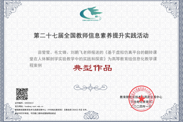 近日,教育部教育技术与资源发展中心(中央电化教育馆)发布《关于总结2023年全国师生信息素养提升实践活动(第二十七届教师活动)参与情况的通知》,我校推荐的作品有3件获奖,其中1件被评为典型作品,2件被评为研讨作品。 据悉,本届交流活动共收来自全国各省(区、市)和新疆生产建设兵团的课件、微课、信息化教学课程案例等作品3509件,经技术测试和专业指导教师推荐,共产生创新作品532件、典型作品911件、研讨作品1290件。在这些作品中,我校医学影像学院苗莹莹团队的《基于虚拟仿真平台的翻转课堂在人体解剖学实验教学中的实践和探索》荣获典型作品;基础医学院王秀菊团队的《卤代烃的亲核加成与消除反应机理》、基础医学院邓青团队的《基因治疗》分别荣获研讨作品。 全国师生信息素养提升实践活动(第二十七届教师活动)由国家教育部直属单位教育技术与资源发展中心(原中央电化教育馆)主办。我校高度重视全国教育信息化学习和交流活动,积极鼓励院系、教师团队参加,努力以信息化理论交流为抓手,以技术应用为切入点,不断提升我校教师的教育教学信息化素养与技术融合应用、创新能力。