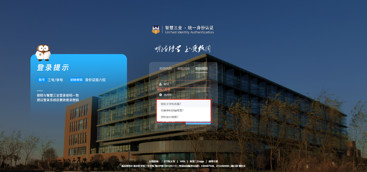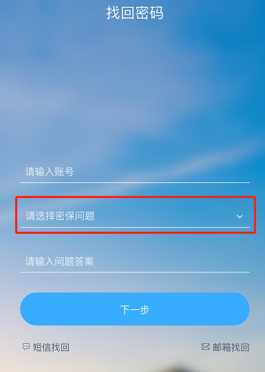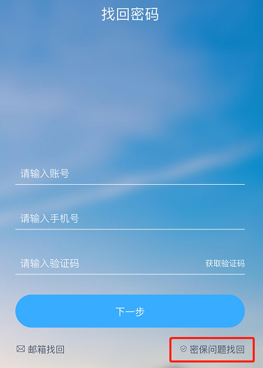 点击短信找回右下角的密保问题找回按钮即可跳转至密保找回页面。