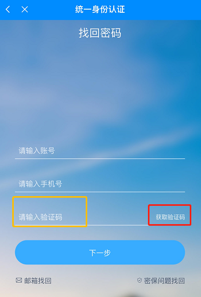 点击短信找回页面左下角的邮箱找回即可进入邮箱找回页面。在邮箱找回页面输入自己的工号/学号、邮箱地址后点击获取验证码按钮。将验证码输入到对应文本框点击下一步即可进入重置密码页面。
