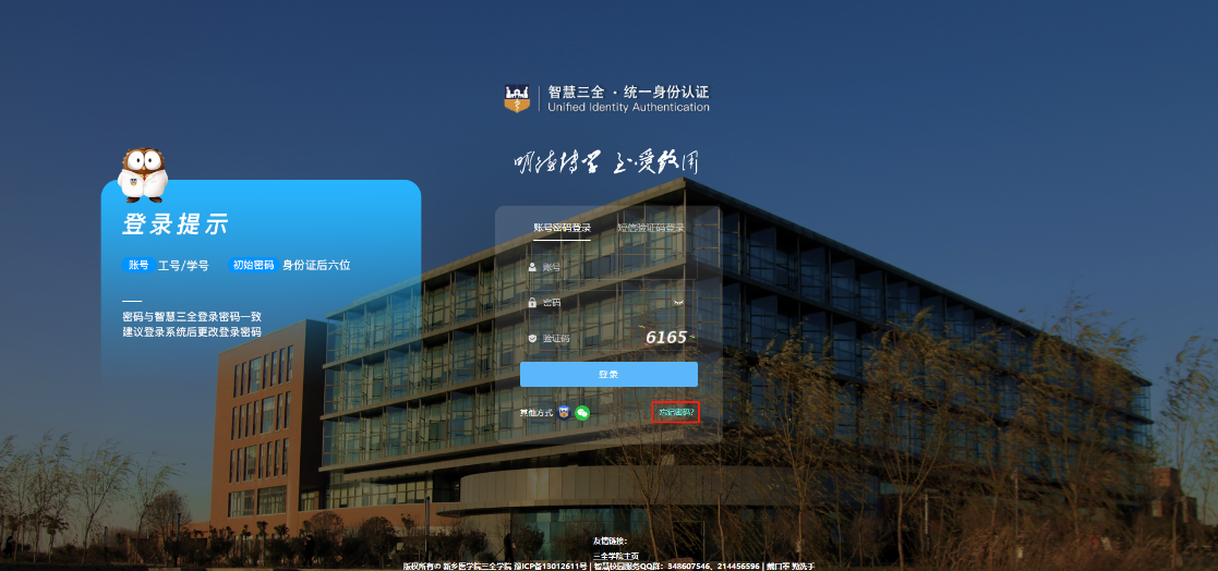 默认进入短信找回页面,输入自己的学号/工号、手机号后点击获取验证码,将验证码填入对应文本框点击下一步即可进入重置密码页面。输入新密码后点击重置密码即可完成重置。