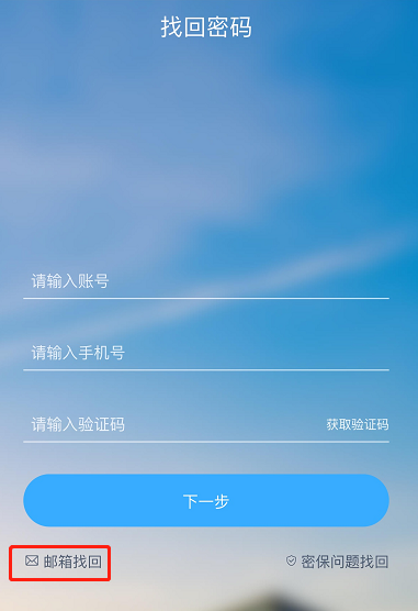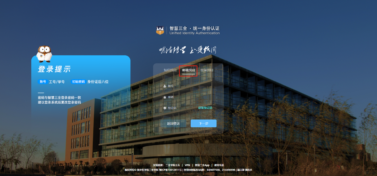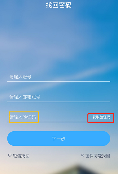 邮箱找回 点击短信找回页面左下角的邮箱找回即可进入邮箱找回页面。在邮箱找回页面输入自己的工号/学号、邮箱地址后点击获取验证码按钮。将验证码输入到对应文本框点击下一步即可进入重置密码页面。