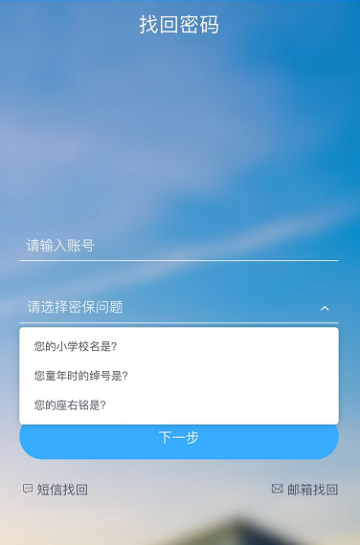 密保找回 点击短信找回右下角的密保问题找回按钮即可跳转至密保找回页面。