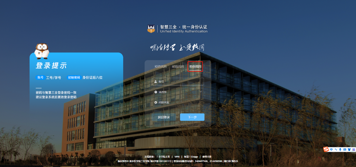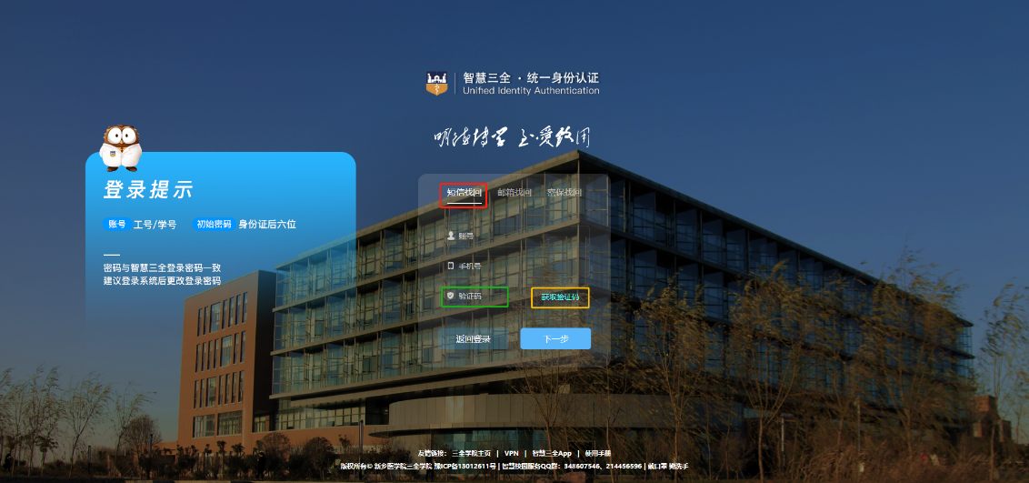 短信找回 进入找回页面时默认进入短信找回页面,若切换至其他页面可点击红框内按钮切换回短信找回页面,输入自己的工号/学号、手机号后点击获取验证码按钮,将验证码输入对应文本框点击下一步进入重置密码页面。