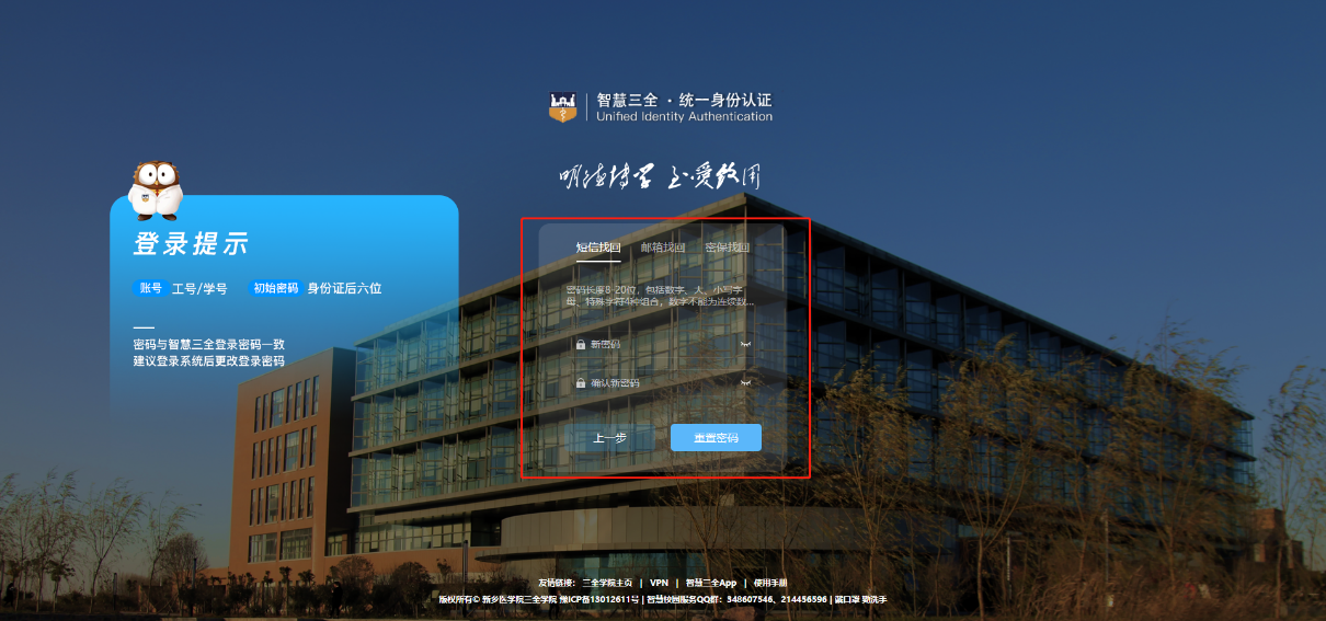 短信找回 默认进入短信找回页面,输入自己的学号/工号、手机号后点击获取验证码,将验证码填入对应文本框点击下一步即可进入重置密码页面。输入新密码后点击重置密码即可完成重置。