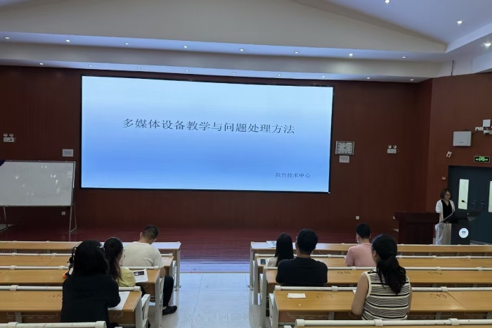 8月27日下午,我中心在谨学楼阶梯教室开展“多媒体设备教学与问题处理方法”专题培训。本次培训为我中心内部培训,由杨利军老师进行主持讲授,部门领导与教师集体参加,主要讲解平原校区多媒体教室的日常使用与问题处理等内容。 为保障学校日常教学活动的顺利进行,我中心全体老师持续参与多媒体教学值班工作,履行值班职责,按制度做好多媒体教学设备的值班管理工作,确保了教学实践的顺利开展。 本次培训中,杨利军老师首先讲解了我校平原校区中的谨学楼、弘学楼和交流中心,三座楼宇中教室的多媒体设备类型与使用情况,并对目前教室使用的多种多媒体设备的基础操作进行了概述;之后展示了日常工作中总结的设备突发问题的处理方法,并形成纸质文件进行分发学习,讲解的最后,杨利军老师突出强调了我中心设立的《教育技术中心多媒体教学值班制度》,提醒各位教师认真遵守。 讲解结束后,我中心领导对相关工作进行了补充点评,并对参会教师一一叮嘱,强调了教学基础保障工作的重要性和优先性,各位老师应该积极配合,保障全校教育教学的顺利开展。
